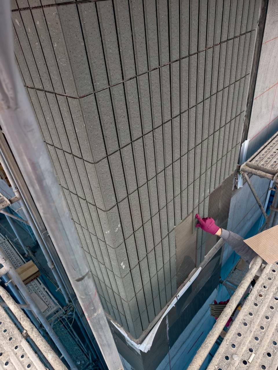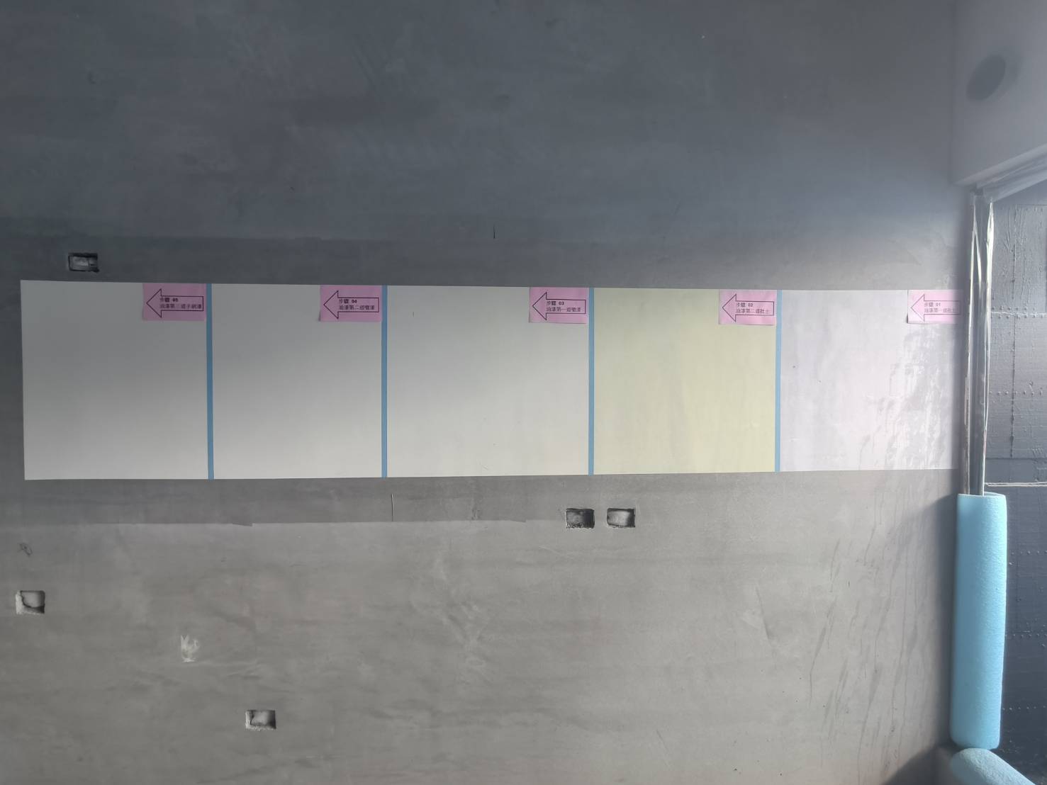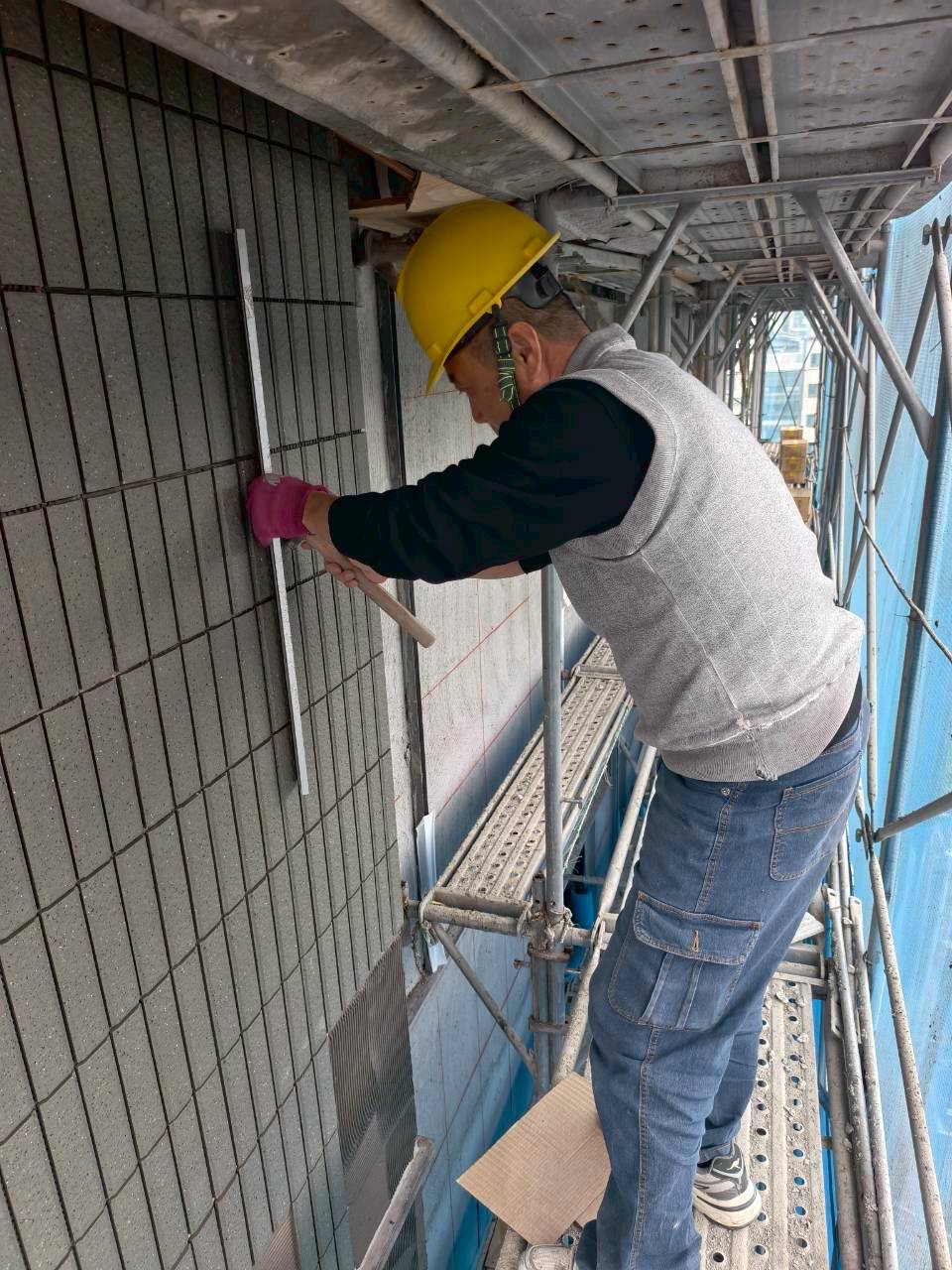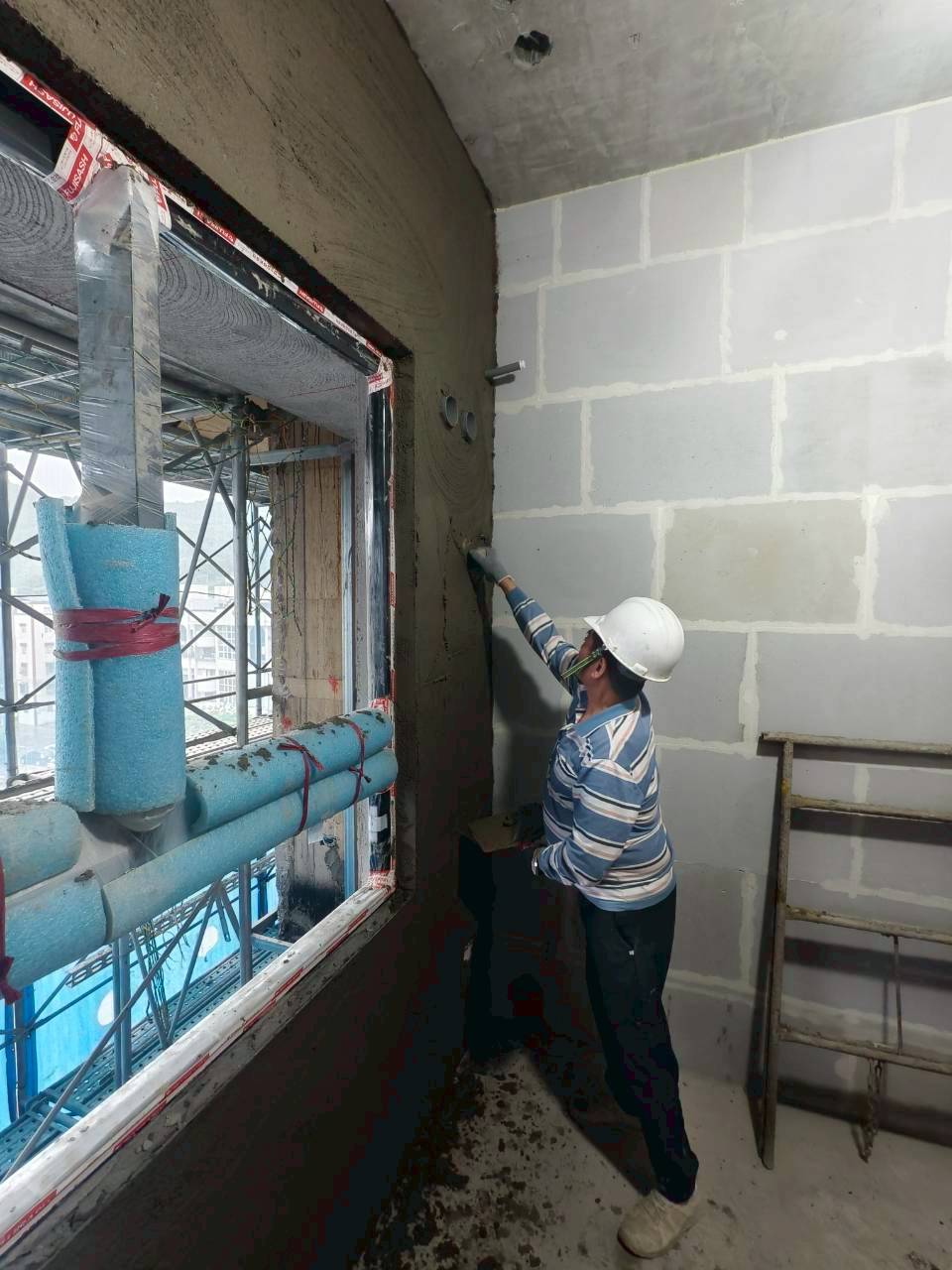 7樓A戶隔間施工|3F-4F泥作 AE戶施作中|3F~8F外牆左右側金屬分割飾條安裝